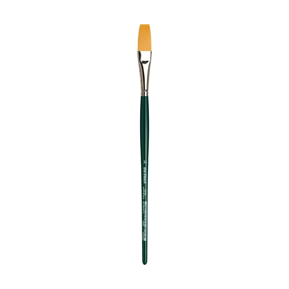 Πινέλο Da Vinci NOVA one stroke Series 1370 πλακέ No.14 με τρίχα μεσαίου μήκους. Είναι κατάλληλο για χρώματα νερού. Κατασκευασμένο από εξαιρετική συνθετική ίνα σε χρυσή απόχρωση. Διαθέτει κοντή πράσινη γυαλιστερή λαβή.