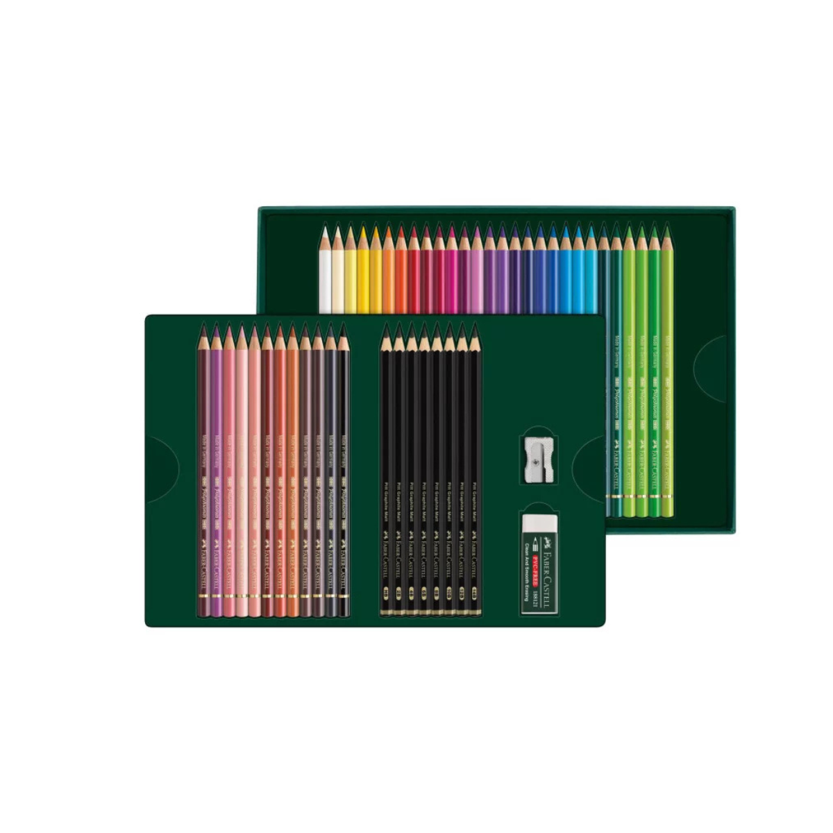 Το σετ περιλαμβάνει 32 Polychromos μολύβια και 6 Pitt Graphite Matt, μαζί με ποιοτικά αξεσουάρ, γόμα και ξύστρα, όλα σε κομψή, συλλεκτική συσκευασία δώρου.