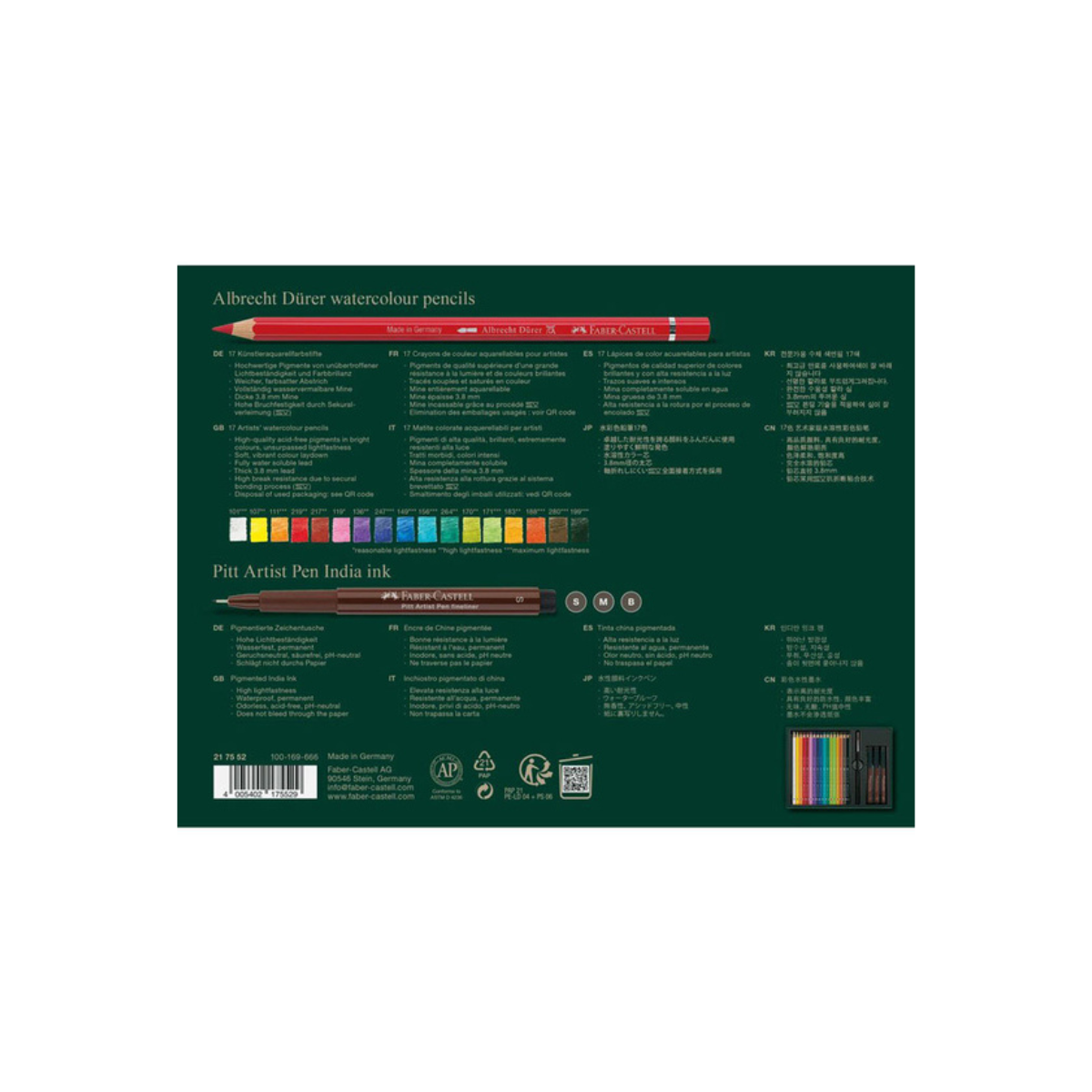 Το πλήρες σετ συνδυάζει υδατοδιαλυτές ξυλομπογιές και μαρκαδόρους ινδικής μελάνης με ανθεκτική μύτη πινέλο για ευκολία, προσφέροντας απεριόριστες δυνατότητες. Οι γνωστές ξυλομπογιές Albrecht Durer διαθέτουν μύτη 3.8mm, οι οποίες εφαρμόζουν απαλά στο χαρτί, αφήνοντας έντονο αποτύπωμα. Προσθέτοντας μικρή ποσότητα νερού με ένα πινέλο, μπορείτε να μεταμορφώσετε τα χρώματα ώστε να μοιάζουν με ακουαρέλα. Η υψηλή ποιότητα των υλικών εξασφαλίζει ανθεκτικότητα στο φως και έντονο αποτέλεσμα.