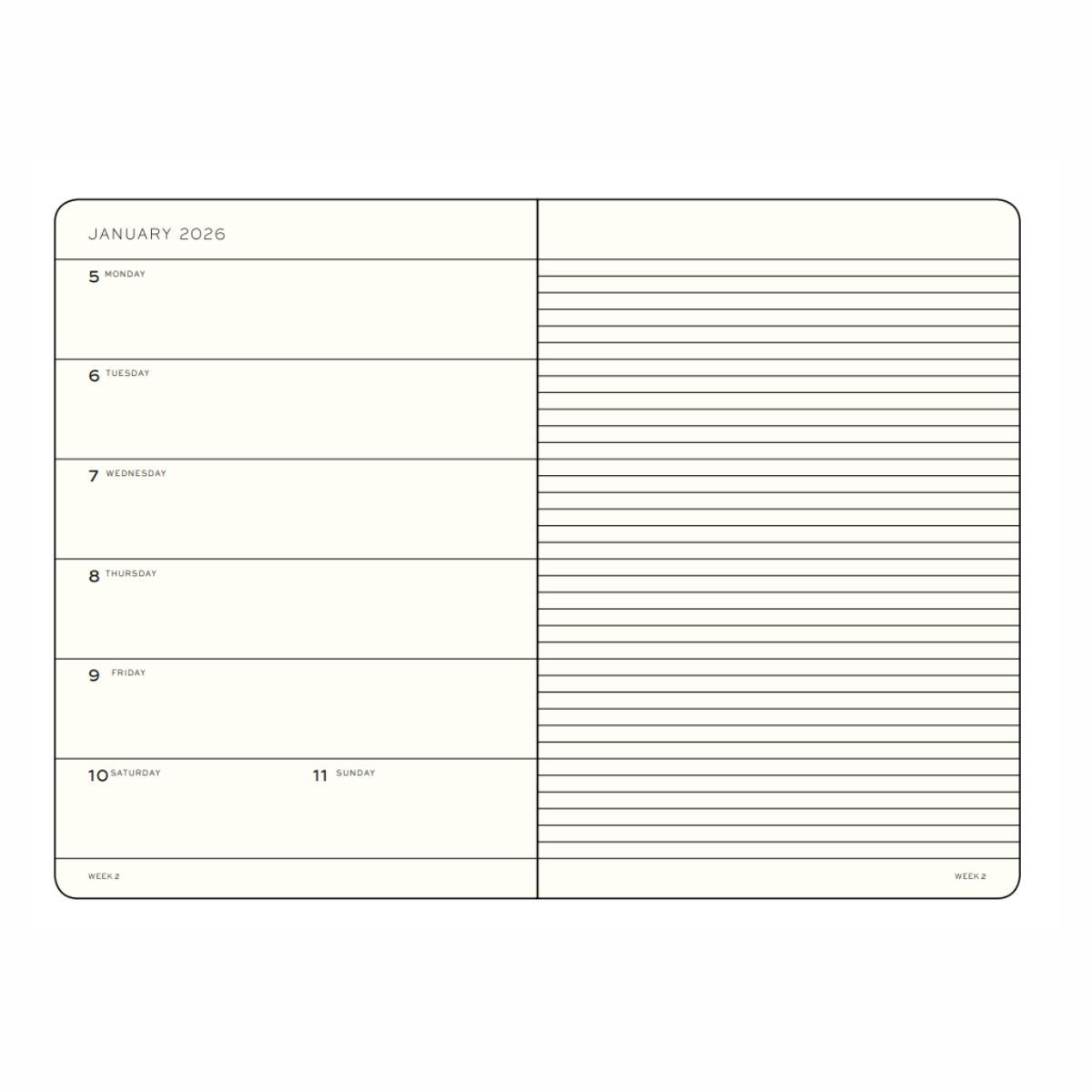 Το μεσαίου μεγέθους εβδομαδιαίο ημερολόγιο Leuchtturm1917 - Ink διαθέτει 144 σελίδες· στην αριστερή σελίδα υπάρχει ένα πλαίσιο για την κάθε ημέρα ώστε να καταγράφετε όλα σας τα καθήκοντα και τις υποχρεώσεις, ενώ στη δεξιά υπάρχει μία ριγέ σελίδα για να σημειώνετε εύκολα και γρήγορα όπου και αν βρίσκεστε.