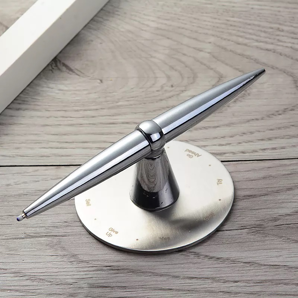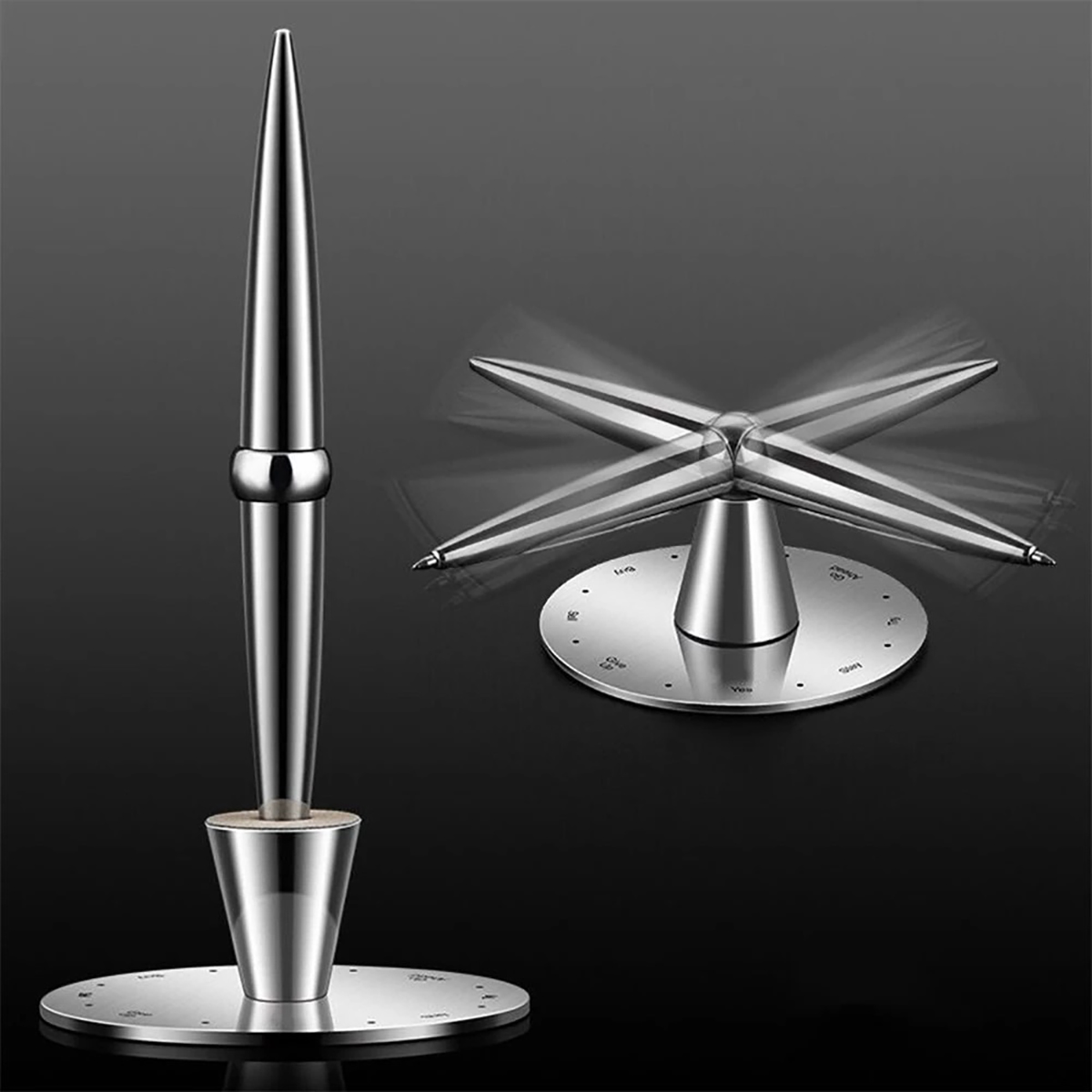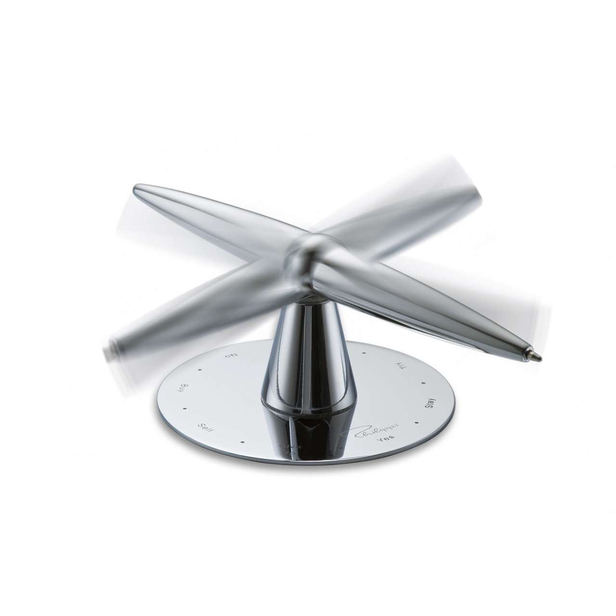 Τοποθετήστε τη μεταλλική βάση πάνω στο μαγνητικό ταμπλό από την μεριά που σας εξυπηρετεί! Από την μία πλευρά μπορείτε να το χρησιμοποιήσετε ως βάση για το στυλό σας και από την άλλη ως μαγνήτη για να το περιστρέψετε. Περιστρέψτε το στυλό helicopter και αυτό θα σας βοηθήσει να πάρετε τη σωστή απόφαση με τη βοήθεια των χαραγμένων απαντήσεων!