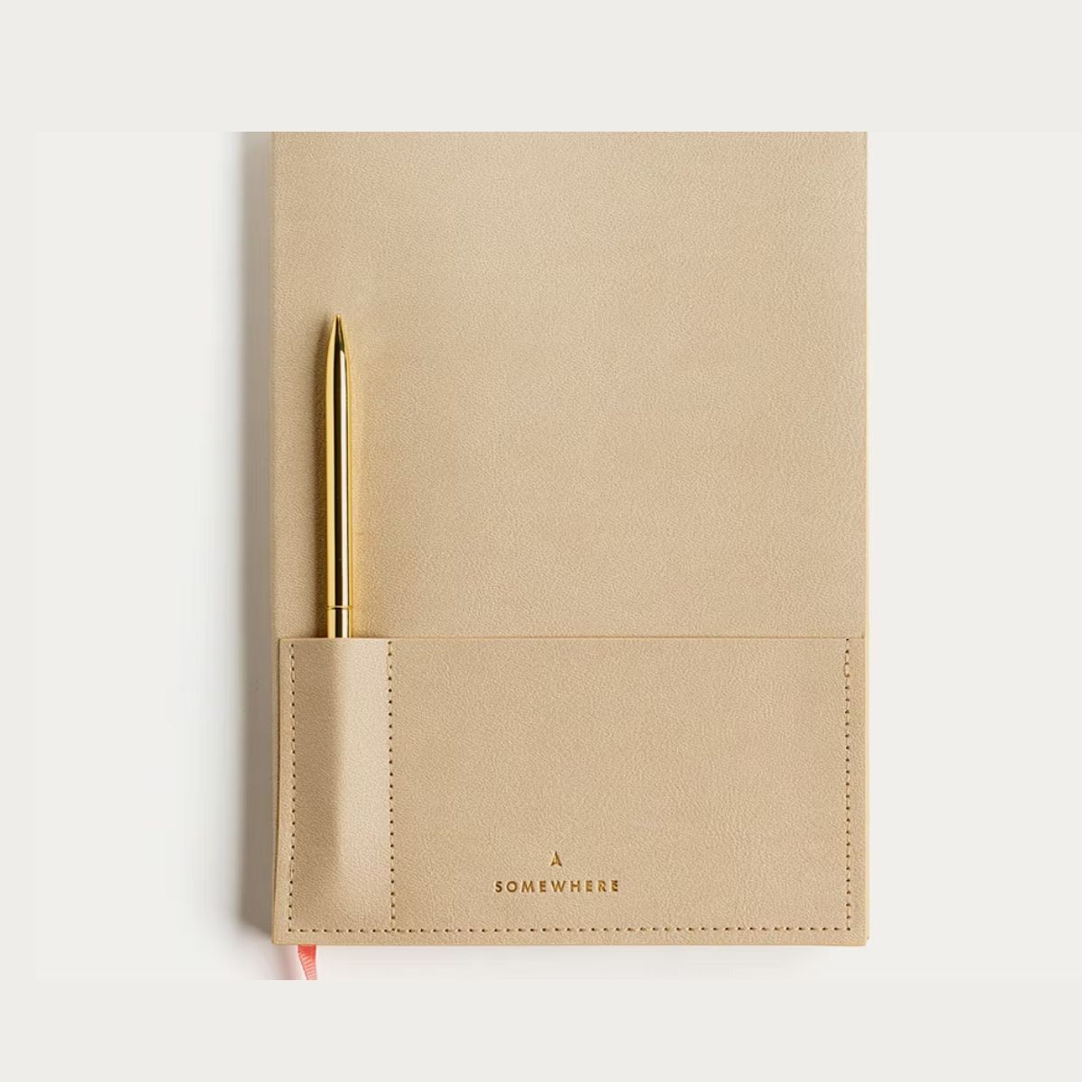 Προσθέστε μία μίνιμαλ πινελιά πολυτέλειας, αλλά και λειτουργικότητας στις καθημερινές σας σημειώσεις, με το νέο σημειωματάριο της εταιρείας Somewhere. Με vegan, απαλό, δερμάτινο εξώφυλλο σε απόχρωση Nude, που περιλαμβάνει θήκη για το στυλό αλλά και το κινητό σας.